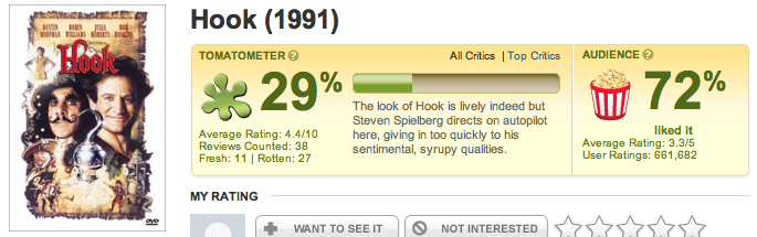 What-tha-F critics?! I’m going with the audience on this one. Hook is a lovely re-imagination of the Peter Pan material!