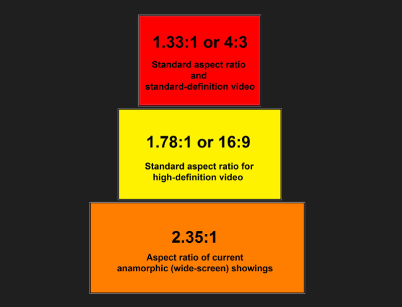 For those of you who don’t know what that number means, it’s an aspect ratio. In the days before High-Definition digital television, 4:3 (pronounced “four by three” or “four three”) was the standard format for everything showed on the small screen. Nowadays all television is displayed in 16:9, and most feature films are 2:35:1. Confused at all? Here’s a chart to show you what they look like: