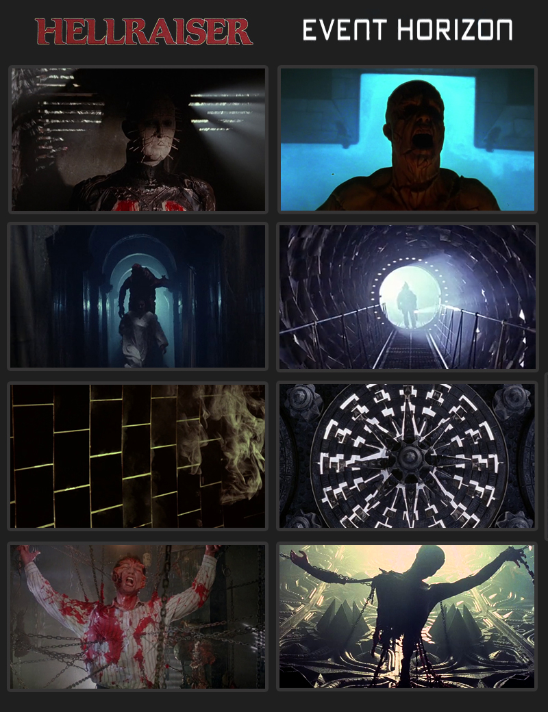 This movie is basically a haunted house film with a science fiction setting. It was directed by Paul W. S. Anderson, not to be confused with Paul Thomas Anderson or Wes Anderson. Paul W. S. Anderson has a failing reputation these days after he went on to make a lot of critically unsuccessful video game and comic book adaptations. His first Hollywood film, Mortal Kombat, was actually a pretty good film, but he followed that up with Resident Evil and AVP:Alien Versus Predator. I actually didn’t mind those films, I liked Resident Evil and AVP was fine as far as I was concerned – but I don’t think most hardcore fans agree. Still, his masterpiece will always be Event Horizon. It proves that he has an undeniable talent for atmospheric filmmaking. What a tremendous piece of work! There is a whole generation of people, which I happen to be part of, that saw this movie at an early age and had many sleepless nights since. I remember being relentlessly tormented by this movie after I saw it, in the way that only the most supreme horror films can accomplish. As I said, it’s also a wonderful homage to Clive Barker’s original masterpiece of hellish imagination. If you have your doubts, here are a handful of shot comparisons that will help prove it to you: