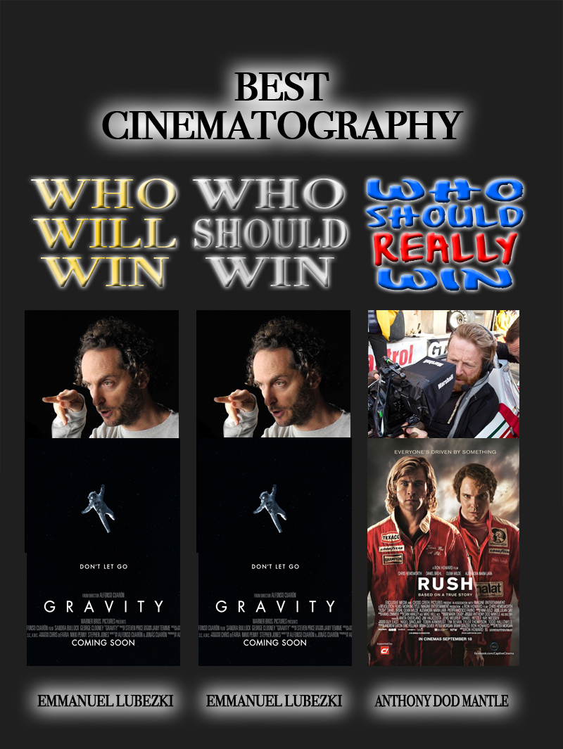 Anyone who has ever tried to light a scene in front of a blue/green screen will know exactly how hard it is to make the foreground and background look as if they truly belong to one another. For that, Emmanuel Lubezki should not only get an Oscar, but deserves the entire guild of cinematographers on their knees in front of him. Worshipping…I mean! Not…not that. Anyway, for my pick…