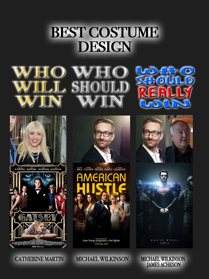 Blah blah blah Great Gatsby blah blah Great Gatsby blah! Boring! Of the nominated costume designers in this category, the only truly deserving winner is Michael Wilkinson for American Hustle. Few films are remember specifically for their costumes, much less could you dress up as one of the characters for a costume party. I have no doubt, however, that I couldn’t don Christian Bale’s outfit and glasses without being recognised as Irving Rosenfeld.