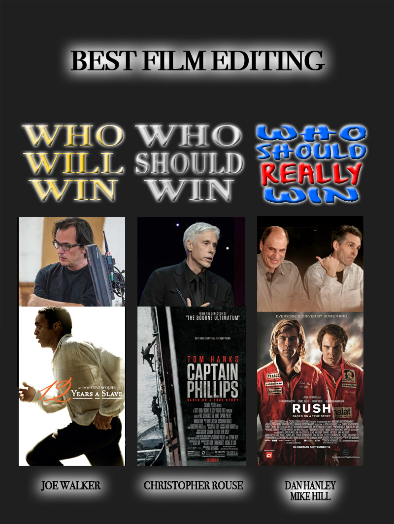 Therefore, I’m taking a stab at 12 Years a Slave…but I’m still rather unsure about it. Personally I’d like to give it to Captain Phillips‘ Christopher Rouse. The sheer amount of footage that Paul Greengrass must have made him wade through is enough to earn him a sympathy Oscar.
