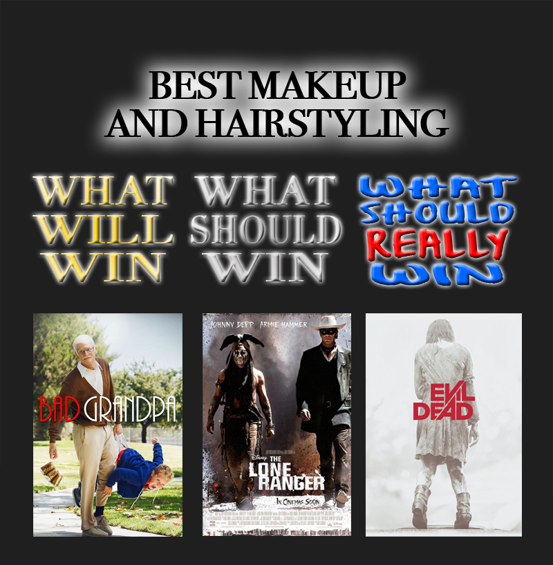 Well, I did actually find Johnny Depp’s look in The Lone Ranger to be the most interesting thing in the film, so what the hell…I’d vote for that one, myself. However, the Academy has stupidly and predictably overlooked Evil Dead. As always, snobbish Academy voters brush off horror films as “vile nonsense”. Well, I’m here to say that Evil Dead had the most outrageous, splashy, shocking, fun, and fleshy gore effects I’ve seen in years. If Bad Grandpa can be up there, so should Evil Dead! Don’t be this stupid again next year, guys!