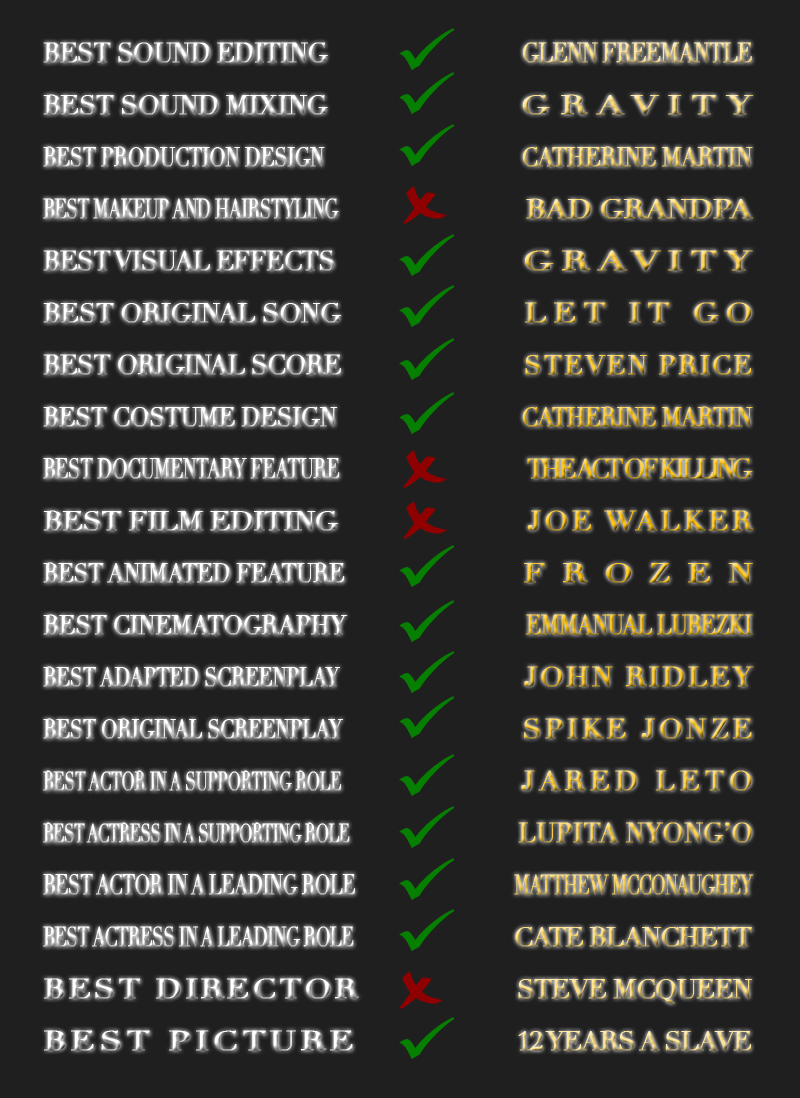 To be fair, it was a very predictable year. Everyone knew that The Wolf of Wall Street, American Hustle, Nebraska, Captain Phillips, and Philomena had practically no chance of winning anything. So I shouldn’t be so proud of myself…right?